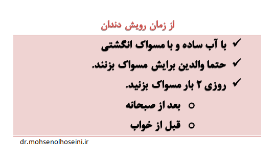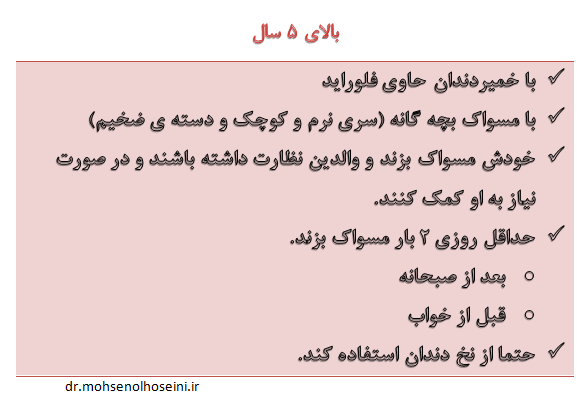 - بعد از مسواک خمیردندان را از دهان بیرون بریزد ولی بهتر است دهانش را با آب نشوئید تا مقدار کمی خمیر دندان داخل دهان باقی بماند و از پوسیدگی دندان پیشگیری کند.