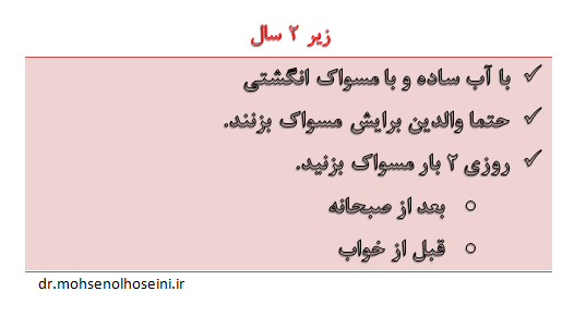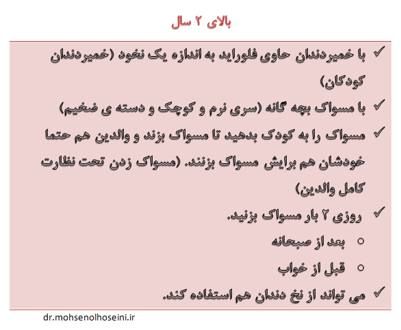 - بعد از دو سالگی با خمیر دندان حاوی فلوراید مخصوص کودکان به اندازه ی یک نخود مسواک بزند. بهترین مسواک برای بعد از دوسالگی، مسواک های با سری نرم و کوچک و دسته ی ضخیم با رنگ ها و طرح های جذاب می باشند.